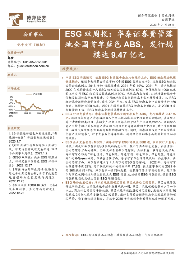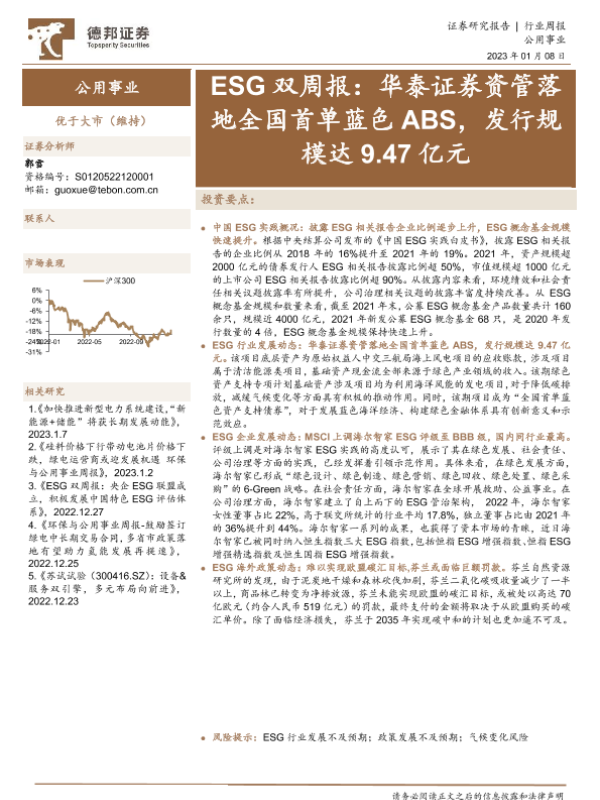 【德邦证券】【20230108】公用事业行业ESG双周报:华泰证券资管落地全国首单蓝色ABS,发行规模达9.47亿元-14页