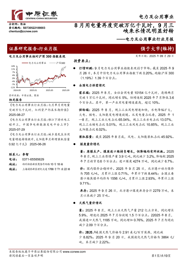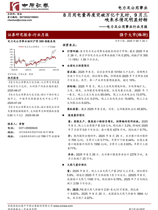 【中原证券】【202509】电力及公用事业行业月报:8月用电量再度突破万亿千瓦时,9月三峡来水情况明显好转-19页