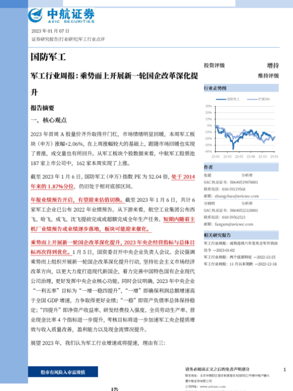 【中航证券】【20230107】军工行业周报:乘势而上开展新一轮国企改革深化提升-16页