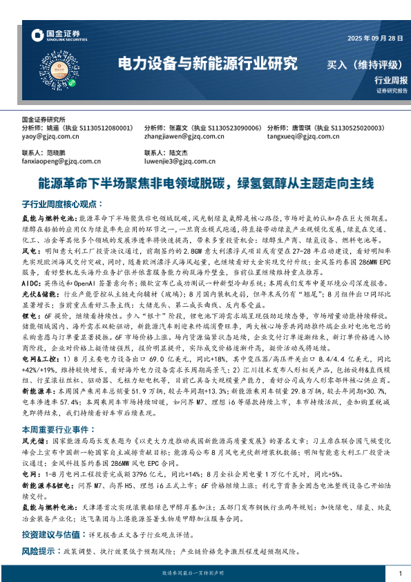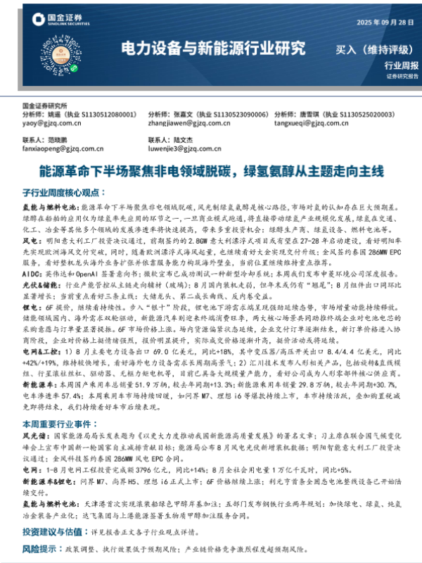 【国金证券】【202509】电力设备与新能源行业研究:能源革命下半场聚焦非电领域脱碳,绿氢氨醇从主题走向主线-14页