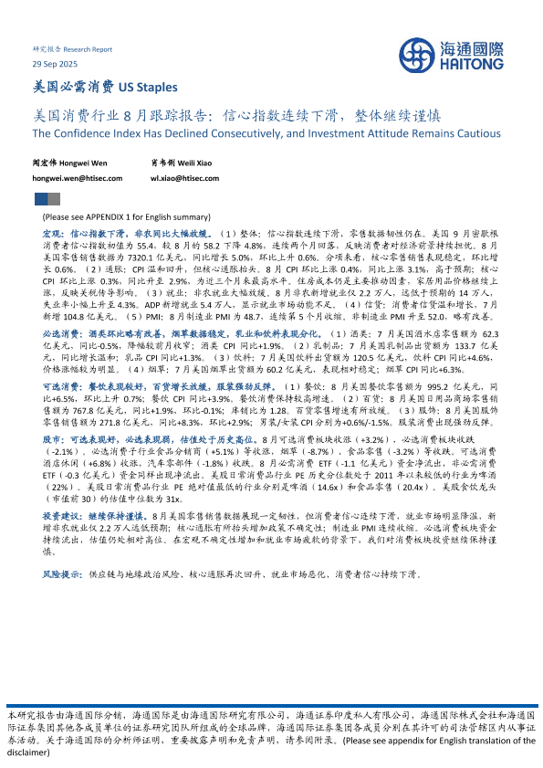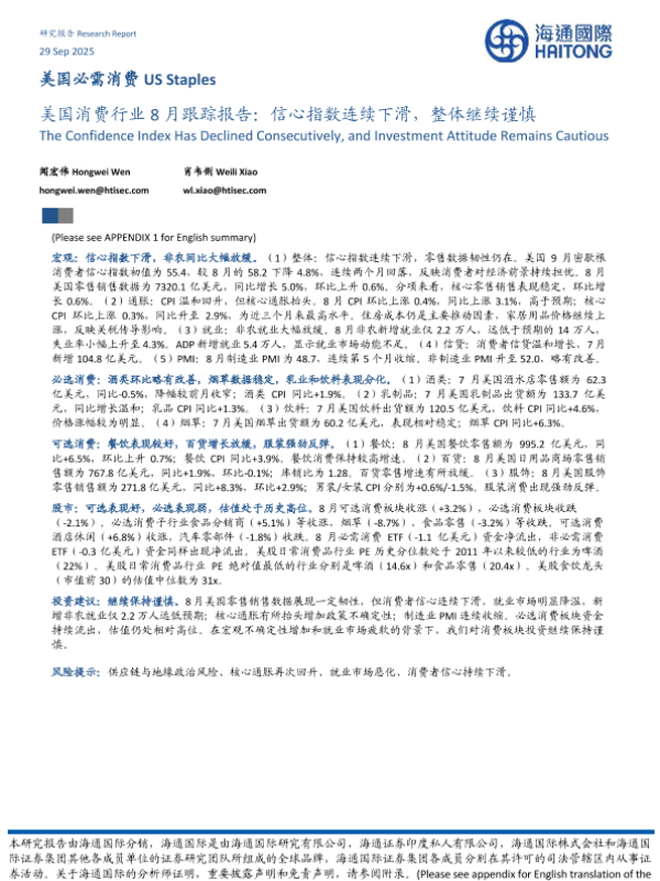 【海通国际】【202509】美国必需消费 US Staples 美国消费行业 8月跟踪报告:信心指数连续下滑,整体继续谨慎-22页
