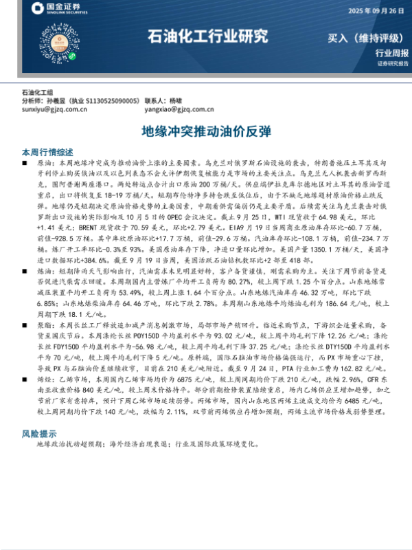 【国金证券】【202509】石油化工行业研究:地缘冲突推动油价反弹-17页