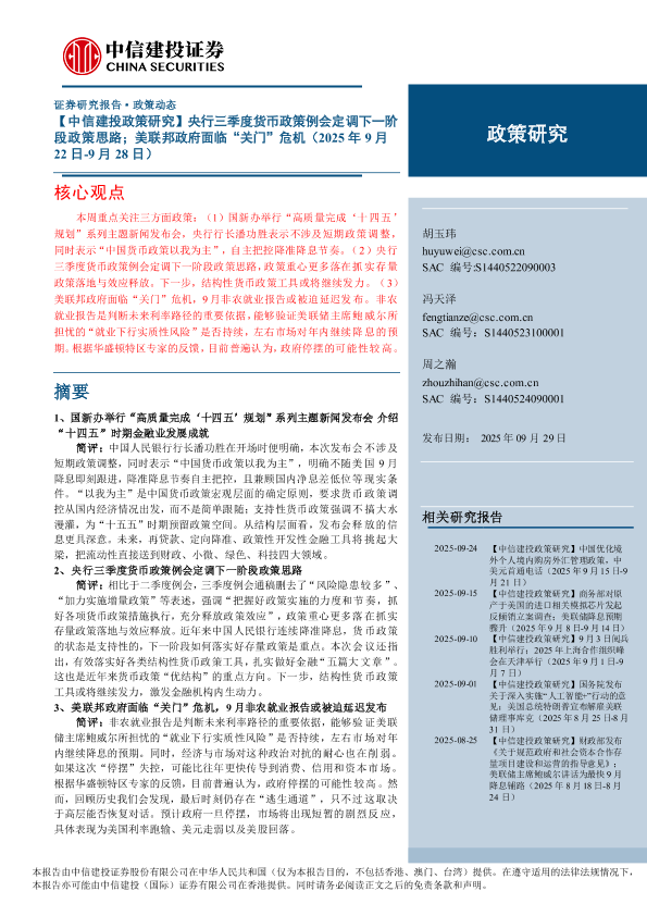 【中信建投证券】【202509】央行三季度货币政策例会定调下一阶段政策思路;美联邦政府面临“关门”危机-14页