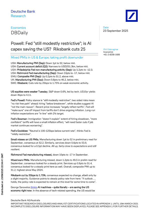 【Deutsche Bank AG/Australia】【202509】Powell Fed"still modestly restrictive"; is AI capex saving the US? Riksbank cuts 25-13页
