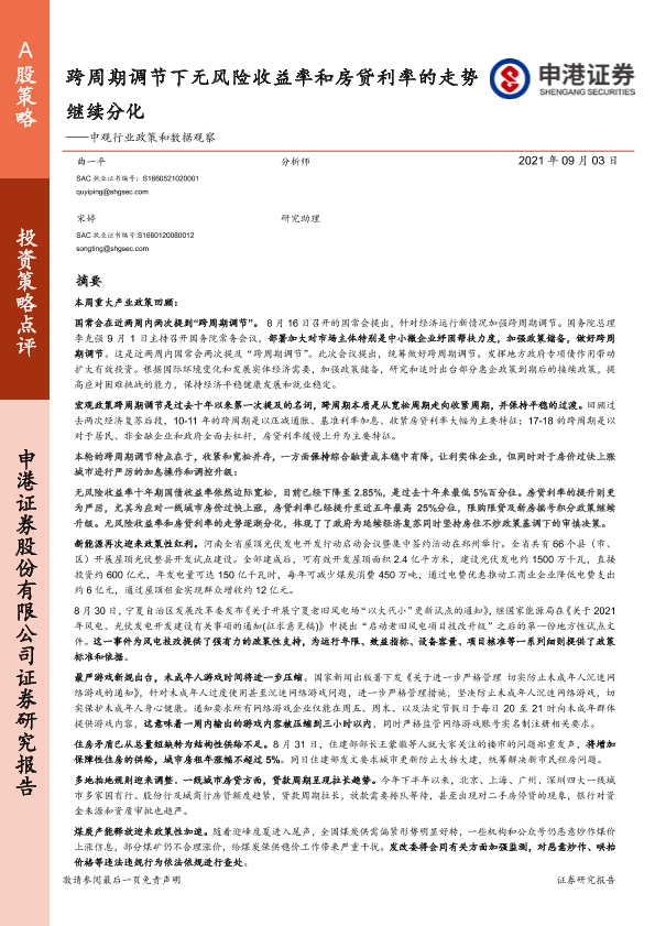 【申港证券】【20210903】中观行业政策和数据观察:跨周期调节下无风险收益率和房贷利率的走势继续分化-53页