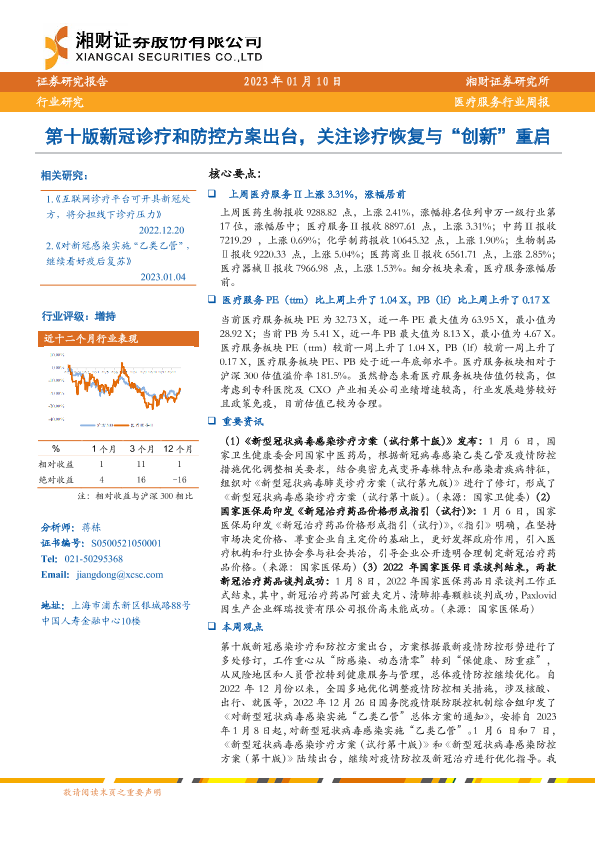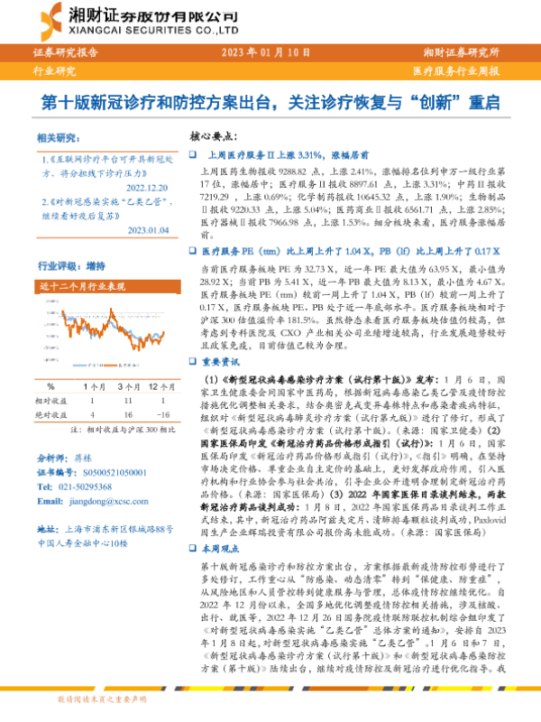 【湘财证券】【20230110】医疗服务行业周报:第十版新冠诊疗和防控方案出台,看诊疗恢复与“创新”重启-14页