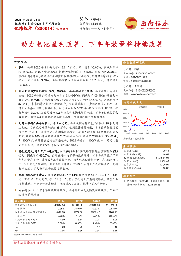 【西南证券】【202509】亿纬锂能(300014)2025年半年报点评:动力电池盈利改善,下半年放量将持续改善-11页