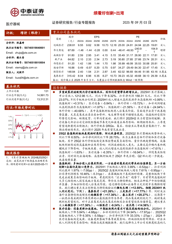 【中泰证券】【202509】医疗器械行业板块2025H1总结:高值耗材有望率先走出政策扰动,继续看好创新+出海-15页