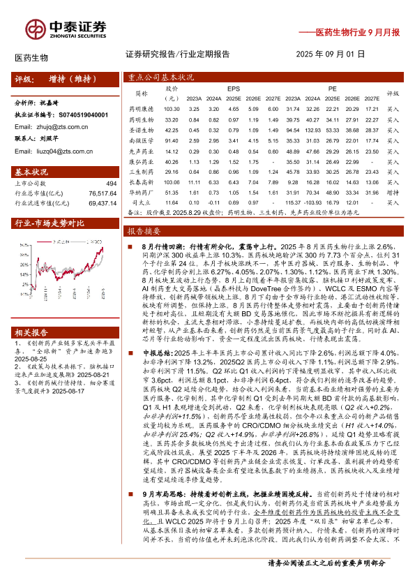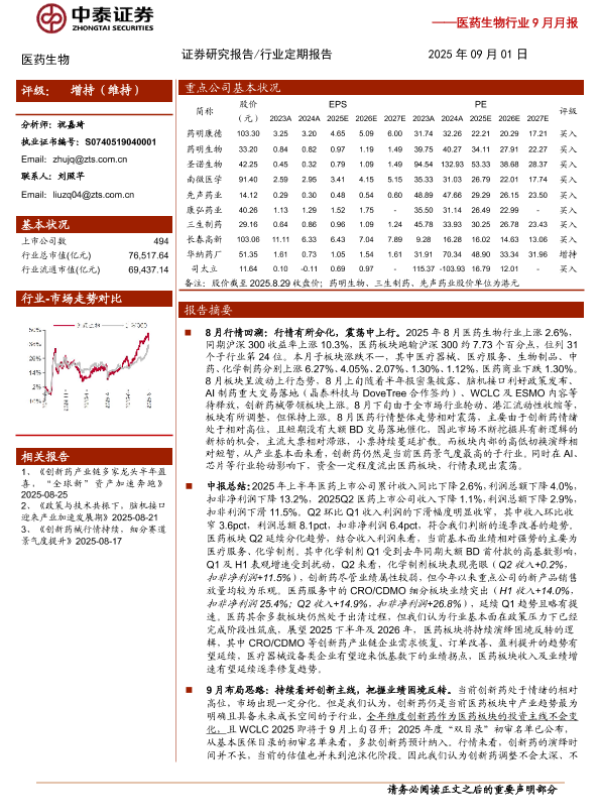 【中泰证券】【202509】医药生物行业9月月报:Q2环比改善、复苏有望延续,持续看好创新主线-24页
