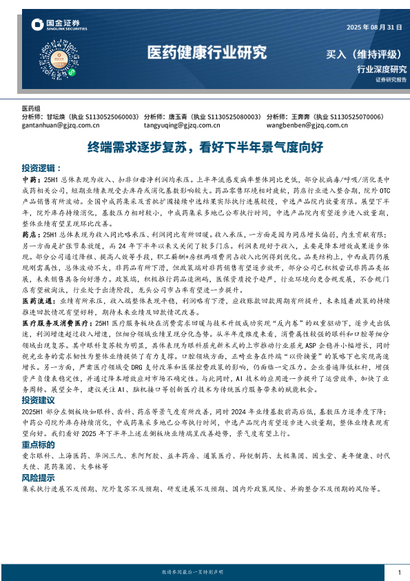 【国金证券】【202508】医药健康行业研究:终端需求逐步复苏,看好下半年景气度向好-23页