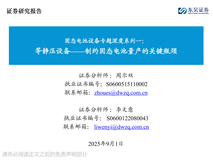 【东吴证券】【202509】固态电池设备专题深度系列一:等静压设备——制约固态电池量产的关键瓶颈-40页