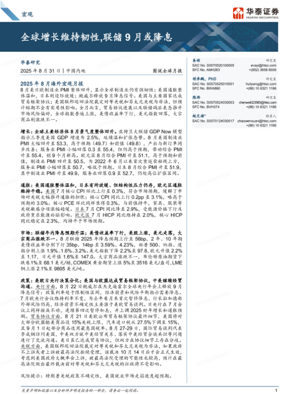 【华泰证券】【202508】图说全球月报:全球增长维持韧性,联储9月或降息-16页