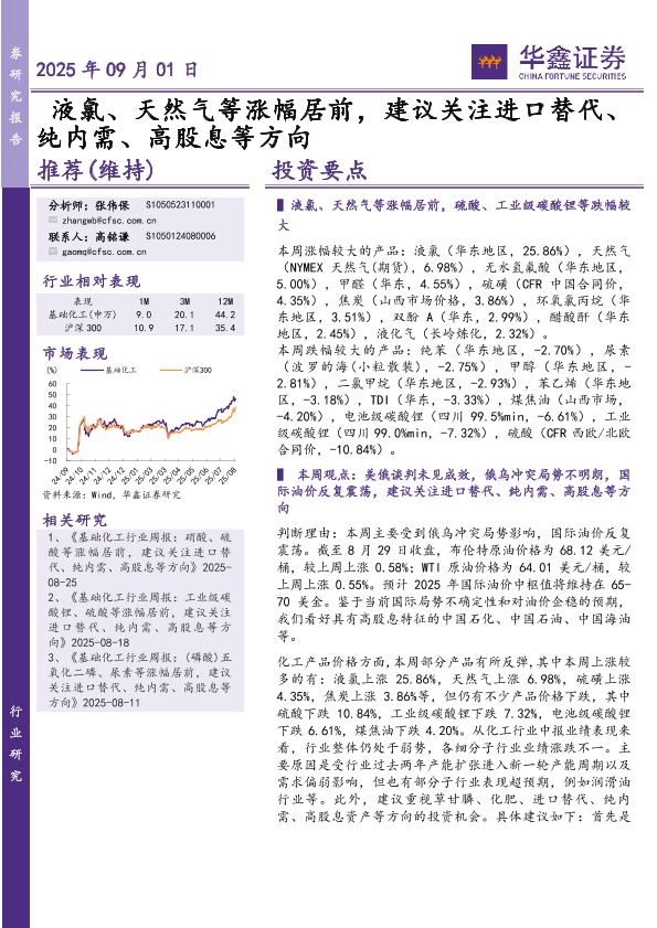 【华鑫证券】【202509】基础化工行业研究:液氯、天然气等涨幅居前,建议关注进口替代、纯内需、高股息等方向-33页