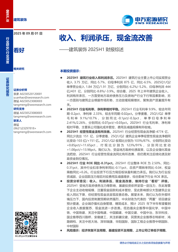 【申万宏源】【202509】建筑装饰 2025H1财报综述:收入、利润承压,现金流改善-18页