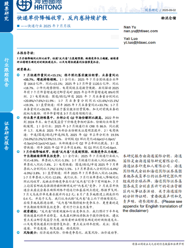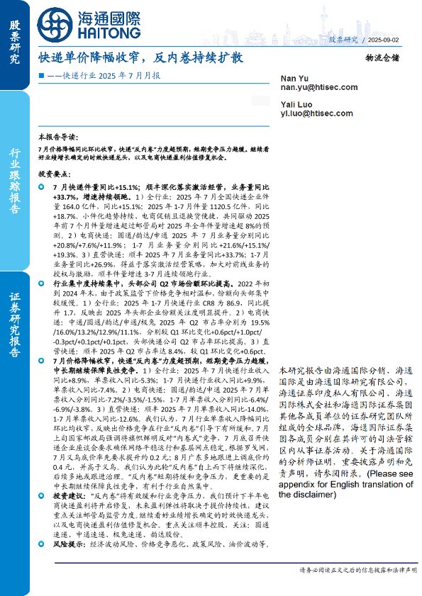 【海通国际】【202508】快递单价降幅收窄,反内卷持续扩散-19页