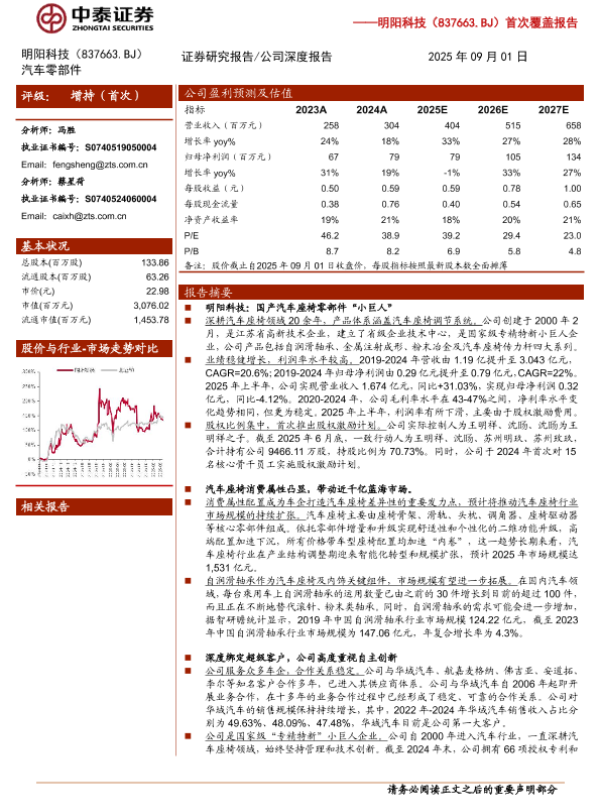 【中泰证券】【202509】明阳科技(837663.BJ)首次覆盖报告:国产汽车座椅零部件“小巨人”,高毛利壁垒下业务持续增长-18页