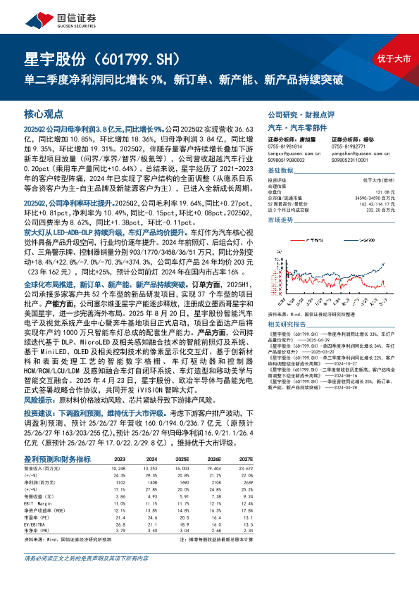 【国信证券】【202509】星宇股份(601799.SH)-单二季度净利润同比增长9%,新订单、新产能、新产品持续突破-15页