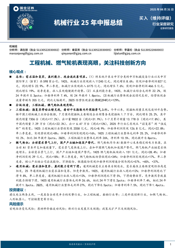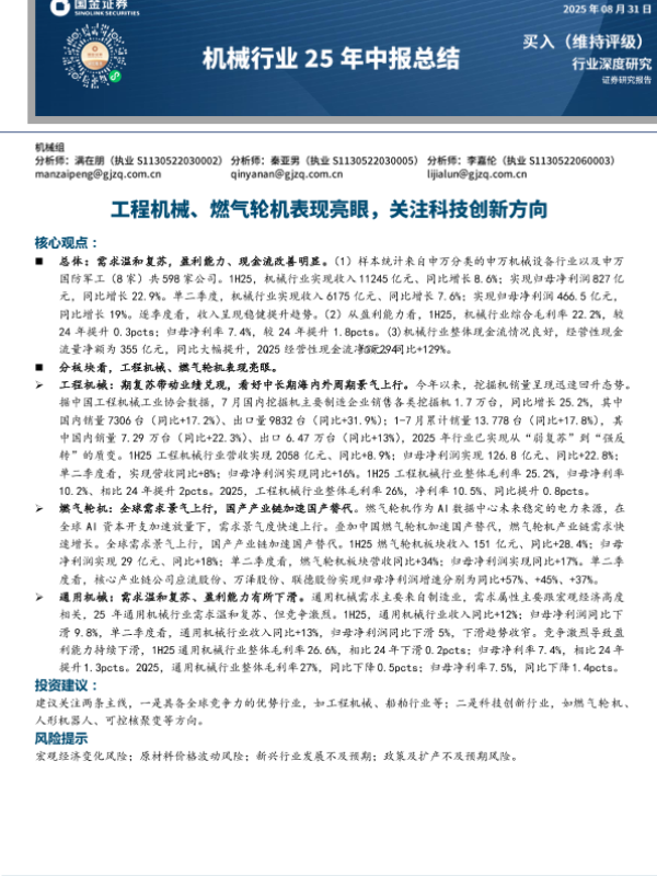 【国金证券】【202508】机械行业25年中报总结:工程机械、燃气轮机表现亮眼,关注科技创新方向-13页