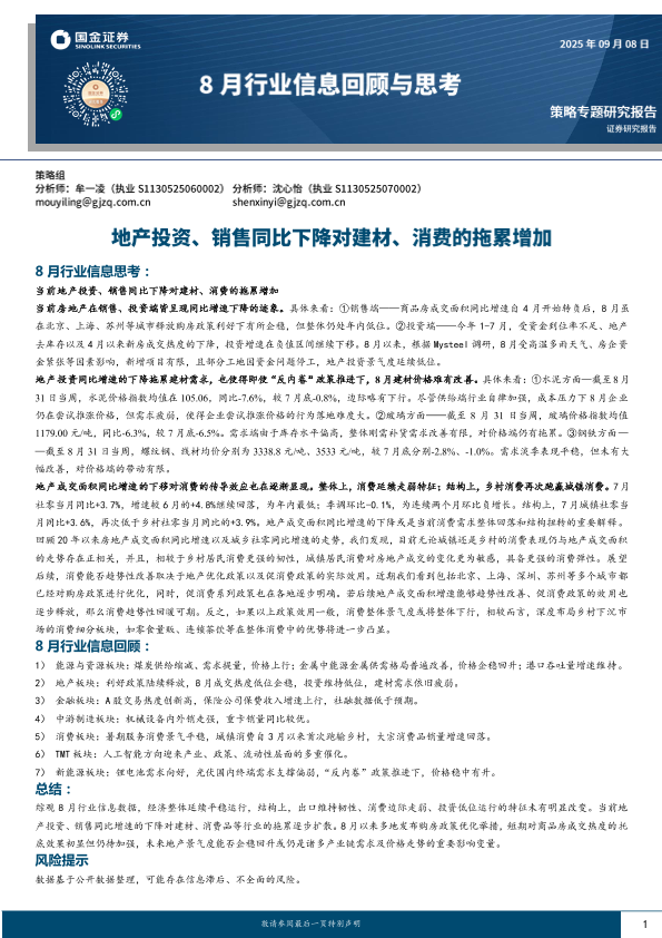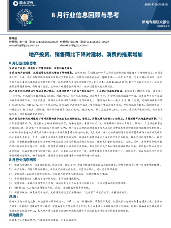 【国金证券】【202408】8月行业信息回顾与思考:地产投资、销售同比下降对建材、消费的拖累增加-16页
