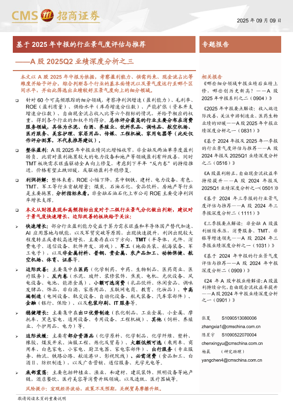 景气度评估 财报分析 行业研究 投资推荐 中报解读
