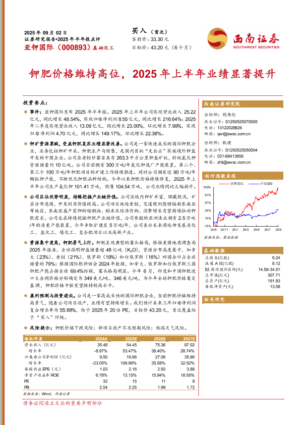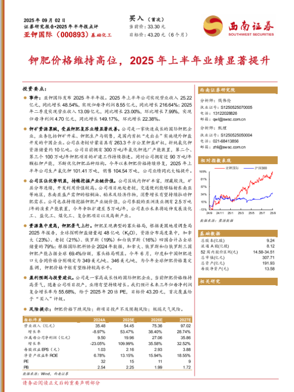 【西南证券】【202509】亚钾国际:钾肥价格维持高位,2025年上半年业绩显著提升-12页