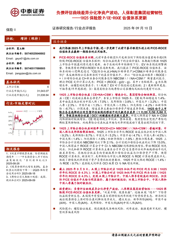 【中泰证券】【202509】负债评估曲线差异分化净资产波动,人保彰显集团经营韧性——1H25保险股 P/CE-ROCE估值体系更新-14页