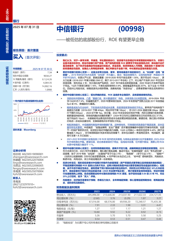 【申万宏源】【202507】中信银行(0998.HK)被低估的底部股份行,ROE有望更早企稳-13页