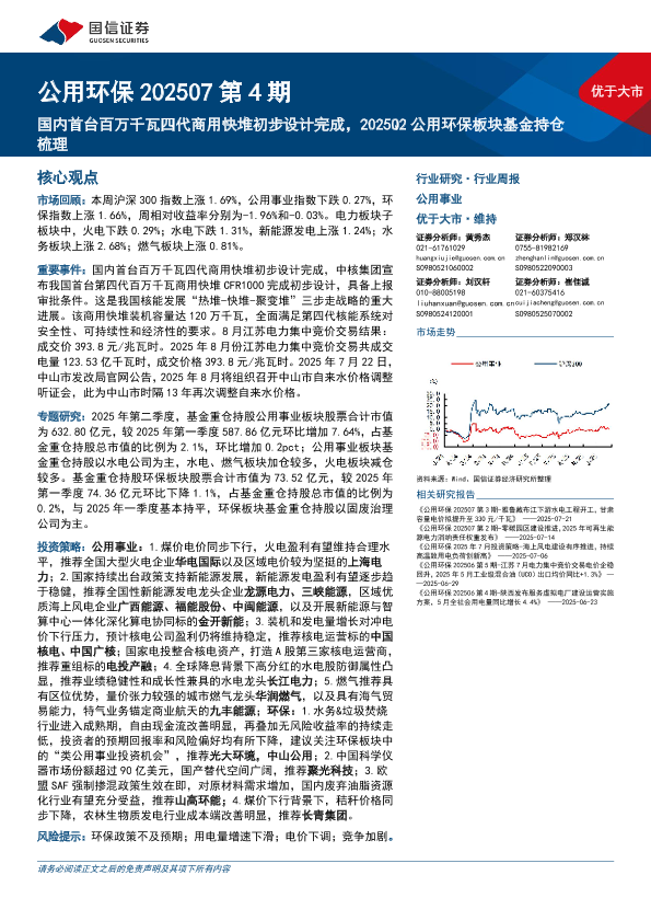【国信证券】【202507】公用环保行业202507第4期:国内首台百万千瓦四代商用快堆初步设计完成,2025Q2公用环保板块基金持仓梳理-30页