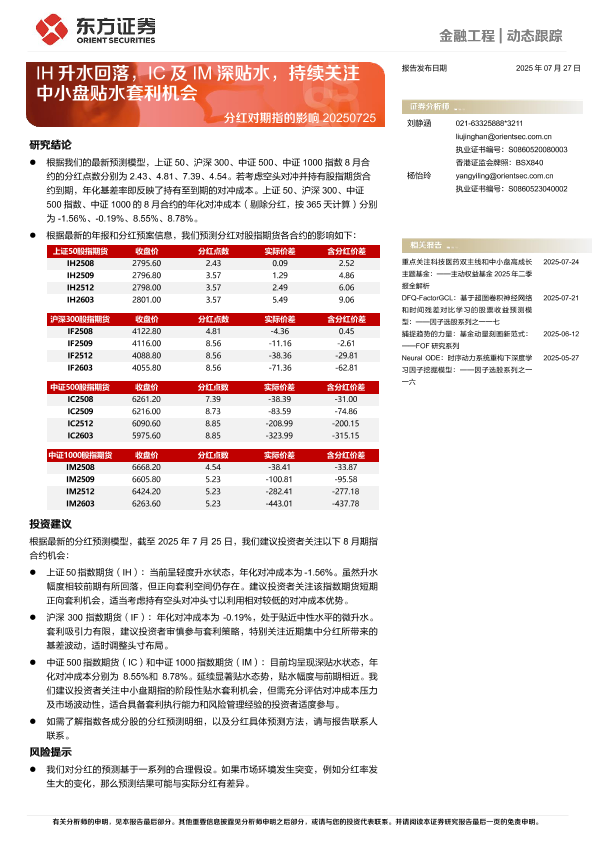 【东方证券】【202507】分红对期指的影响:IH升水回落,IC及IM深贴水,持续关注中小盘贴水套利机会-10页
