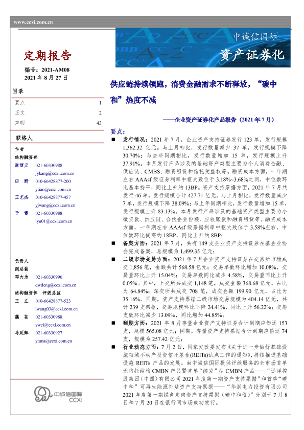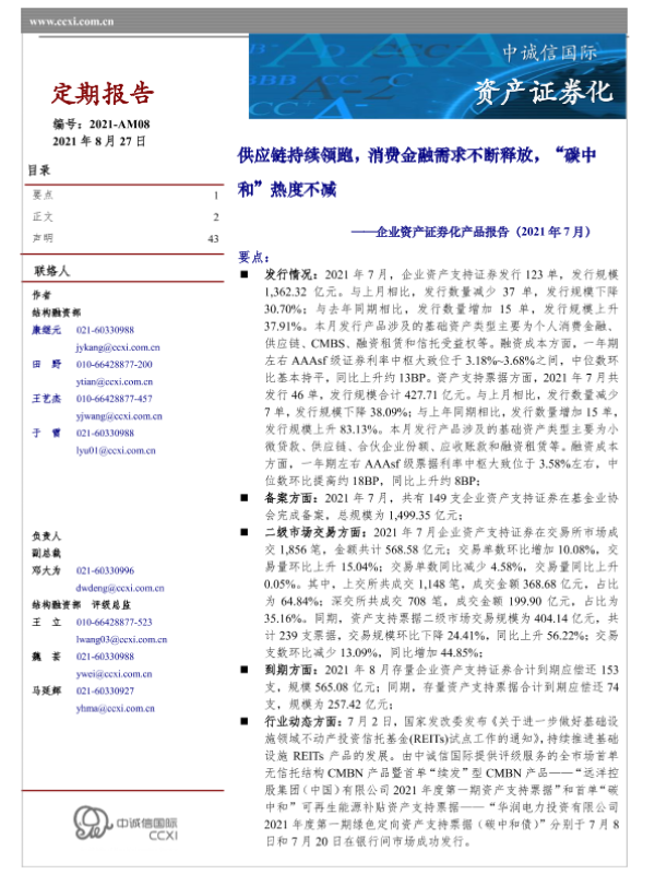 【中诚信国际】【20210827】企业资产证券化产品报告(2021年7月):供应链持续领跑,消费金融需求不断释放,“碳中和”热度不减-43页