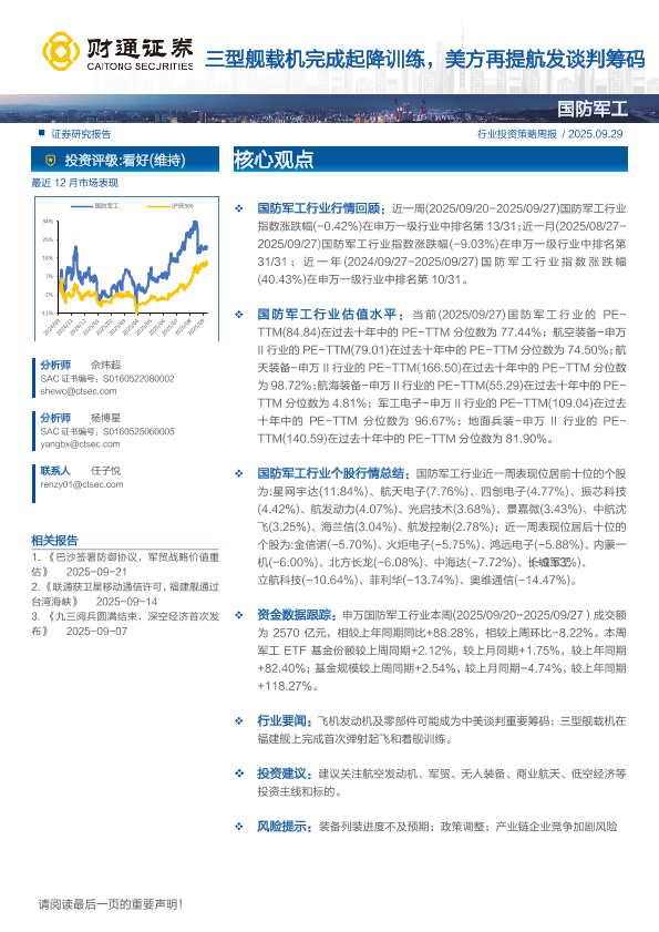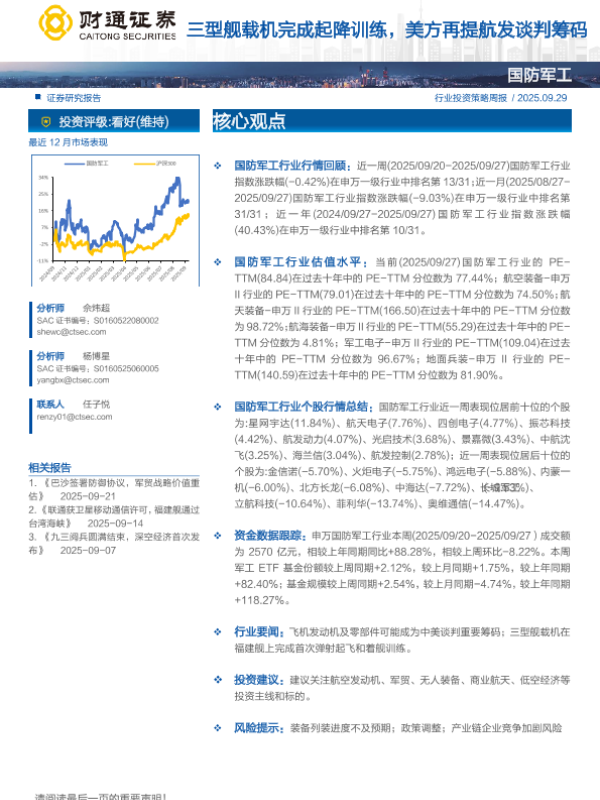 【财通证券】【202509】国防军工行业行情回顾:近一周(2025/09/20-2025/09/27)国防军工行业 指数涨跌幅(-0.42%)在申万一级行业中排名第 13/31;近一月(2025/08/27-2025/09/27)国防军工行业指数涨跌幅(-9.03%)在申万一级行业中排名第 31/31;近一年(2024/09/27-2025/09/27)国防军工行业指数涨跌幅 (40.43%)在申万一级行业中排名第 10/31。-13页