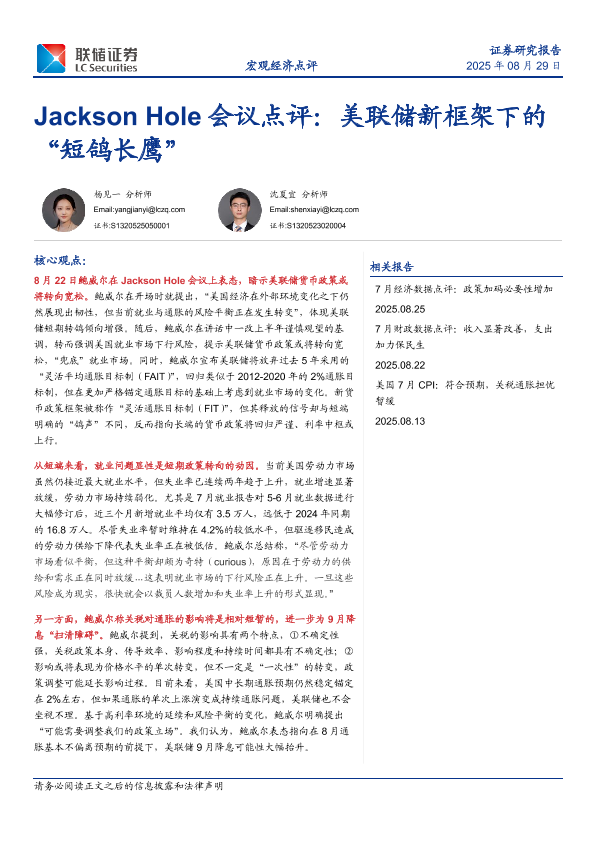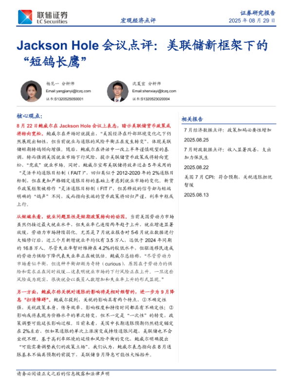 【联储证券】【202508】Jackson Hole会议点评:美联储新框架下的“短鸽长鹰”-10页