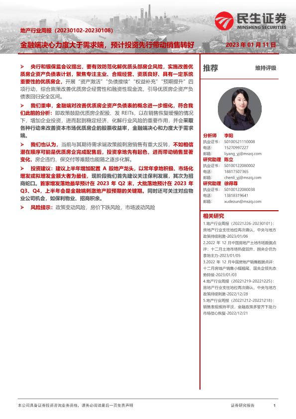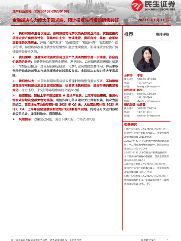 【民生证券】【20230111】地产行业周报:金融端决心力度大于需求端,预计投资先行带动销售转好-19页