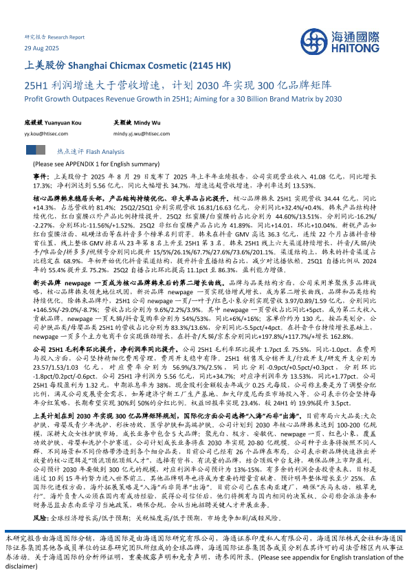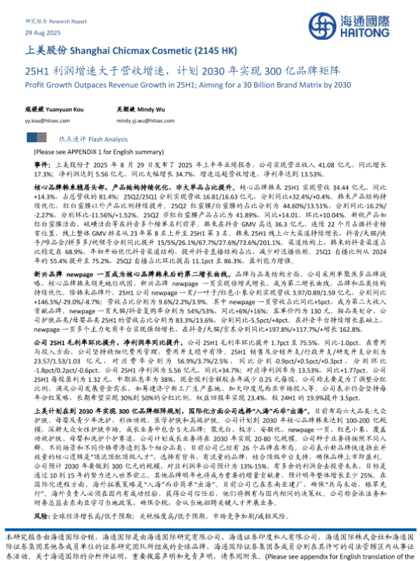 【海通国际】【202508】上美股份25H1利润增速大于营收增速,计划2030年实现300亿品牌矩阵-10页