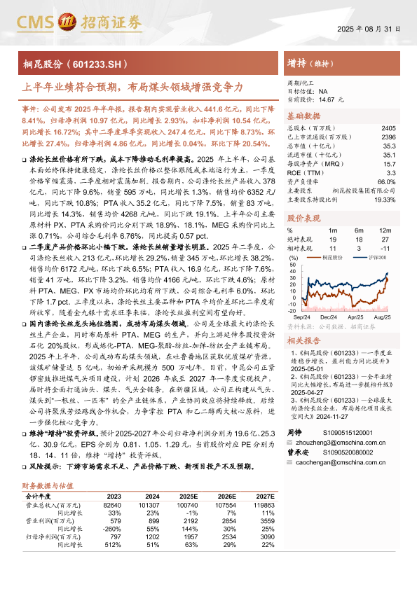 【海通证券】【202508】桐昆股份(601233)上半年业绩符合预期,布局煤头领域增强竞争力-16页