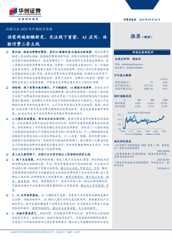 【华创证券】【202509】社服行业2025年中期投资策略:供需两端酝酿新变,关注线下重塑、AI应用、体验消费三条主线-32页