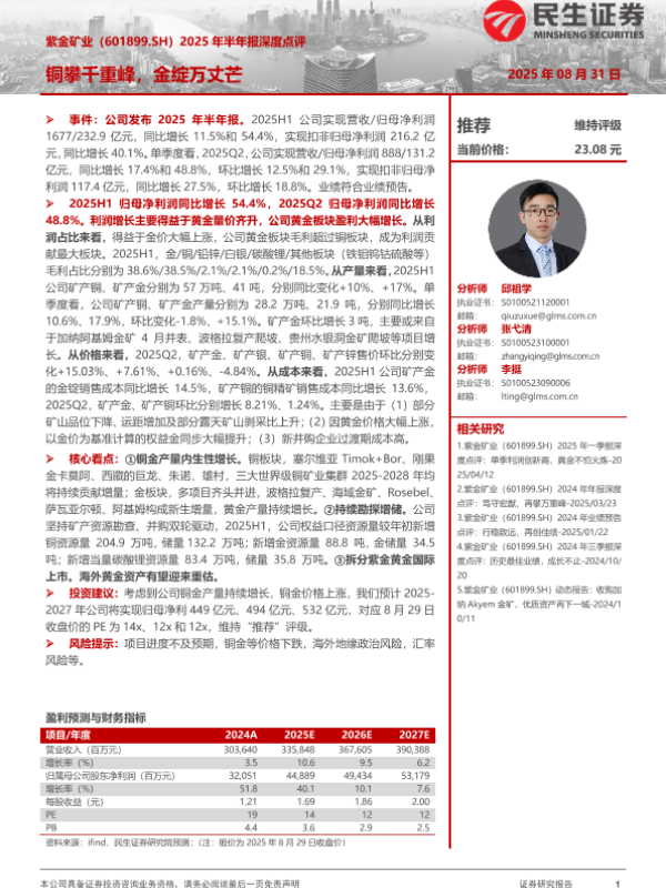 【民生证券】【202508】紫金矿业(601899.SH)2025年半年报深度点评-26页