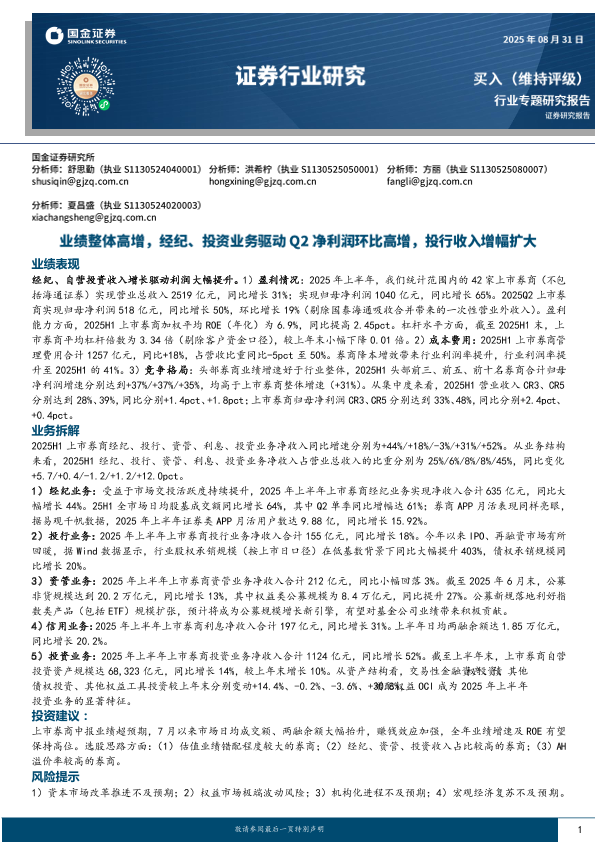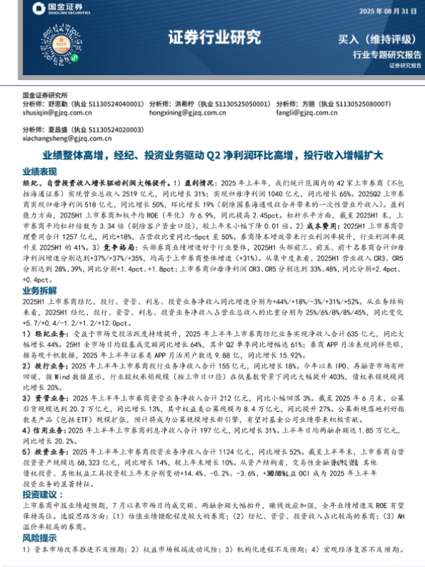 【国金证券】【202508】证券行业研究:业绩整体高增,经纪、投资业务驱动Q2净利润环比高增,投行收入增幅扩大-18页