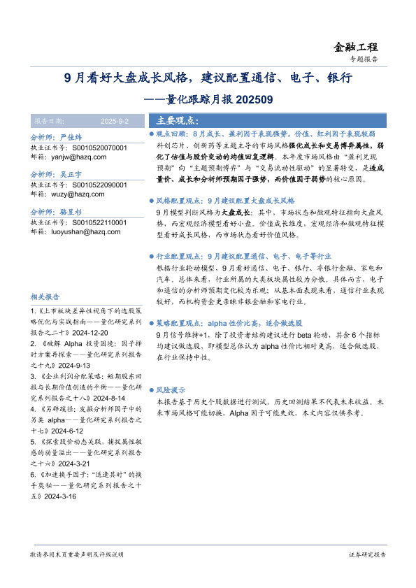 【华安证券】【202509】9月看好大盘成长风格,建议配置通信、电子、银行——量化跟踪月报 202509-13页