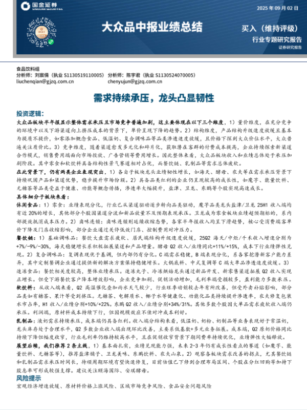 【国金证券】【202509】食品饮料行业专题研究报告:需求持续承压,龙头凸显韧性-19页