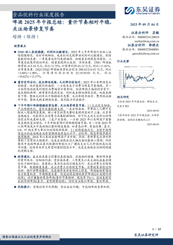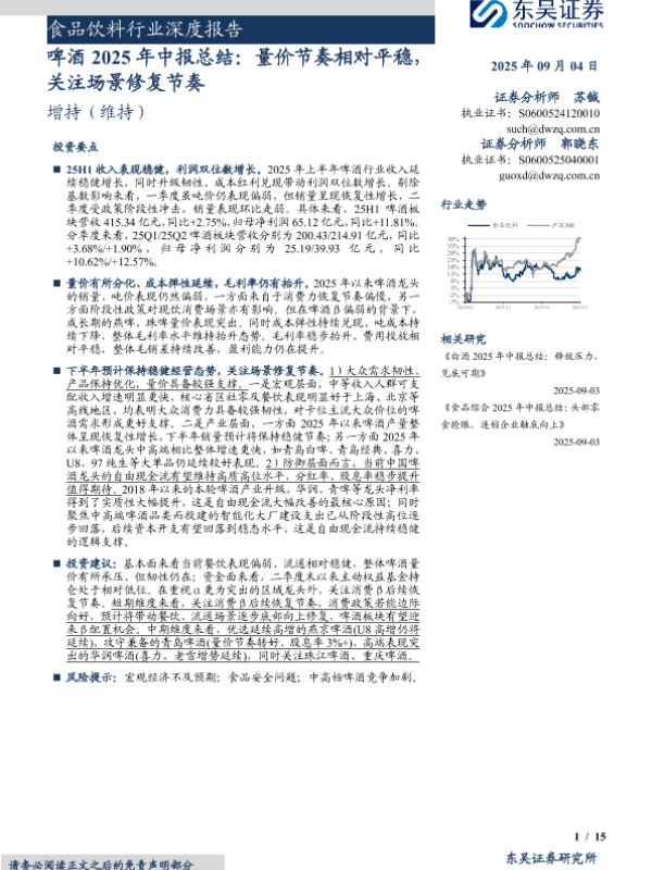 【东吴证券】【202509】食品饮料行业深度报告:啤酒2025年中报总结,量价节奏相对平稳,关注场景修复节奏-15页