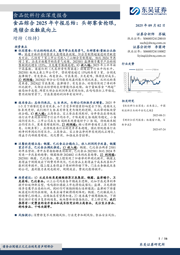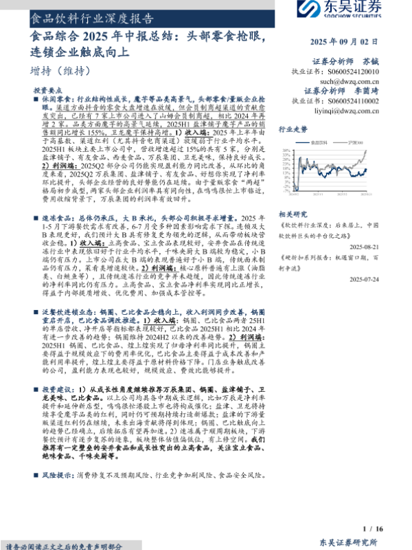 【东吴证券】【202509】食品饮料行业深度报告:食品综合2025年中报总结,头部零食抢眼,连锁企业触底向上-16页