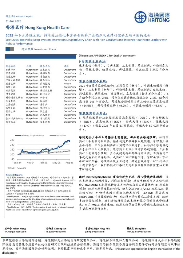 【海通国际】【202508】香港医疗行业2025年9月港股金股:持续关注催化丰富的创新药产业链以及业绩稳健的互联网医药龙头-16页