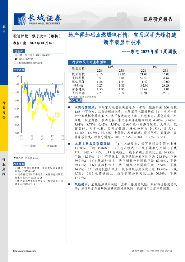 【长城证券】【20230109】家电2023年第1周周报:地产再加码点燃厨电行情,宝马联手光峰打造新车载显示技术-28页