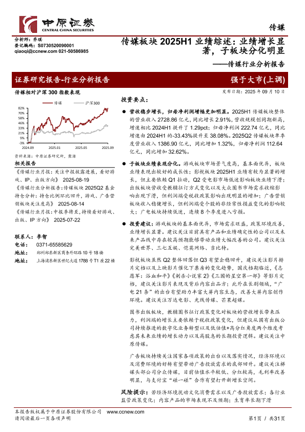 【中原证券】【202509】传媒板块2025H1业绩综述:业绩增长显著,子板块分化明显-31页