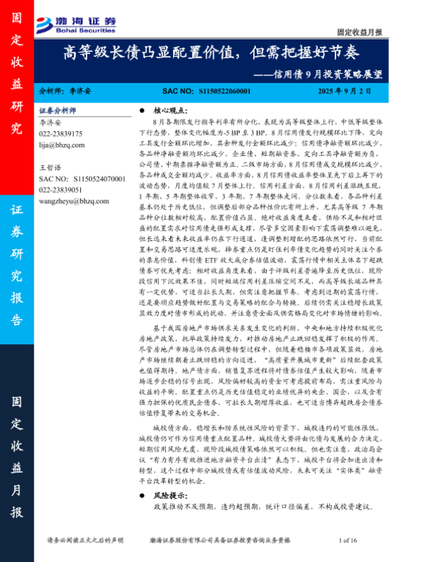 【渤海证券】【202509】高等级长债凸显配置价值,但需把握好节奏――信用债 9月投资策略展望-16页