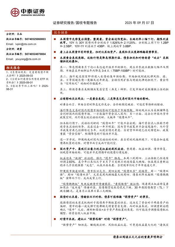 债市分析 降息预期 股债对比 利率策略 黄金走势