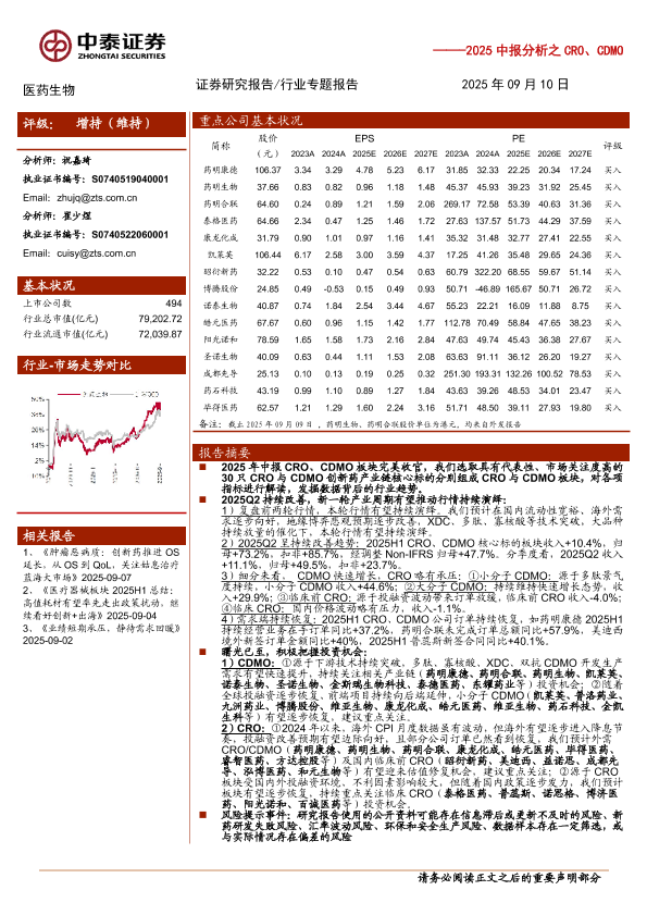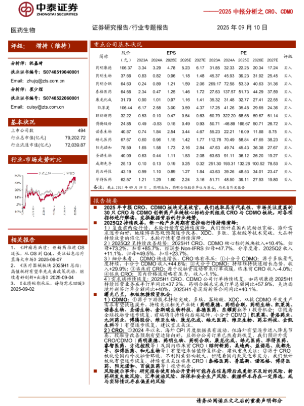 【中泰证券】【202509】医药生物行业2025中报分析之CRO、CDMO:轻舟已过万重山,再举云帆万里程,积极把握新一轮产业周期-14页