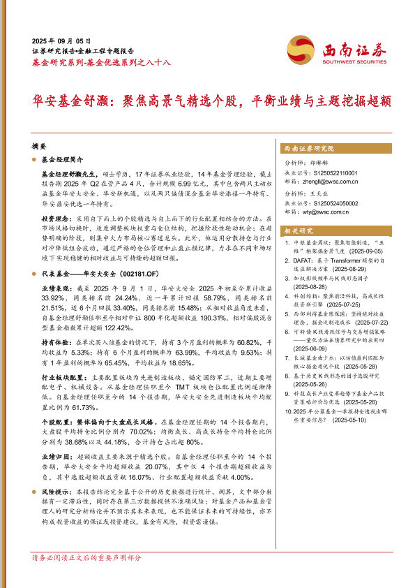 【西南证券】【202509】华安基金舒灏:聚焦高景气精选个股,平衡业绩与主题挖掘超额-23页