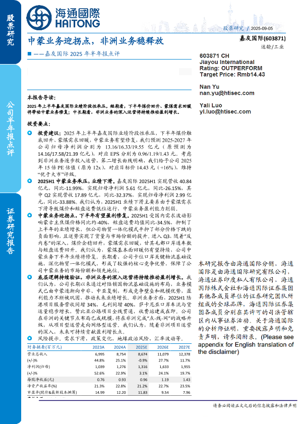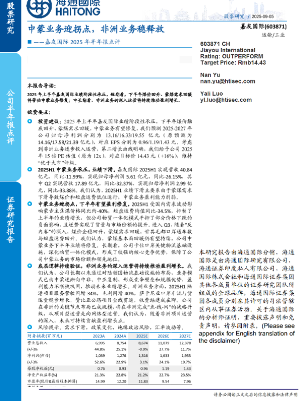 【海通国际】【202509】嘉友国际(603871)2025年半年报点评:中蒙业务迎拐点,非洲业务稳释放-12页